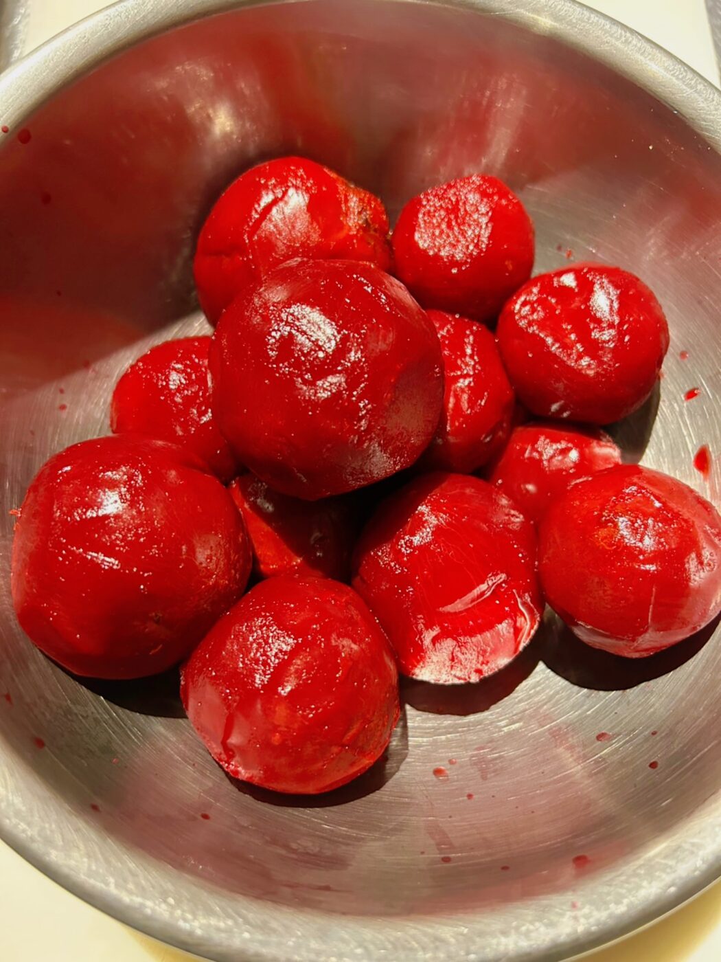UMaMiでは、このビーツをオレンジジュースと皮、シェリーヴィネガー、塩、砂糖、オリーブオイルでマリネ。